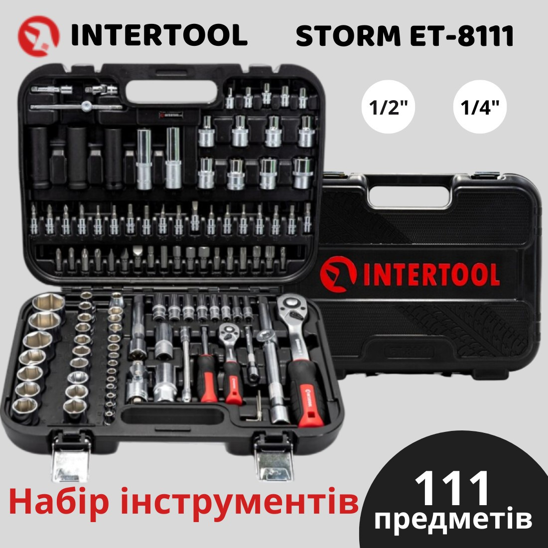 Набір інструментів на 111 од. INTERTOOL ET-8111 серія STORM на дві тріскачки 1/2" і 1/4" з ударними головками. У наборі зібрані всі необхідні інструменти –  подовжувачі, кардани, гнучкий подовжувач і Г-подібні шестигранні ключі дають змогу дістатися важкодоступних місць. З таким широким вибором біт і головок (SL, PZ, PH, TORX, HEX) ви готові впоратися майже з будь-яким типом кріплення!
